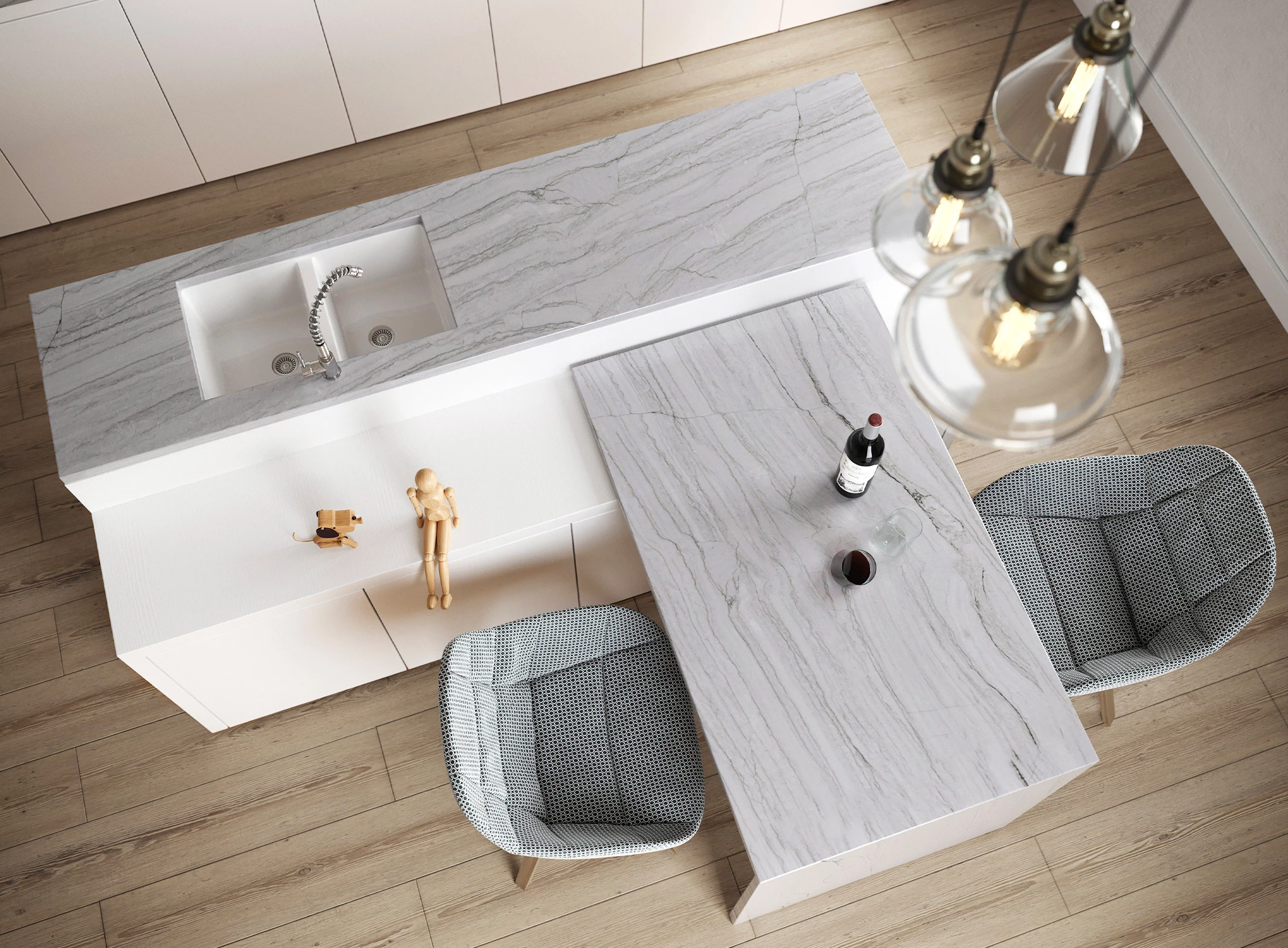 Quarsita amb fons clar i fines vetes grises lineals amb un toc d’elegància i de distinció.