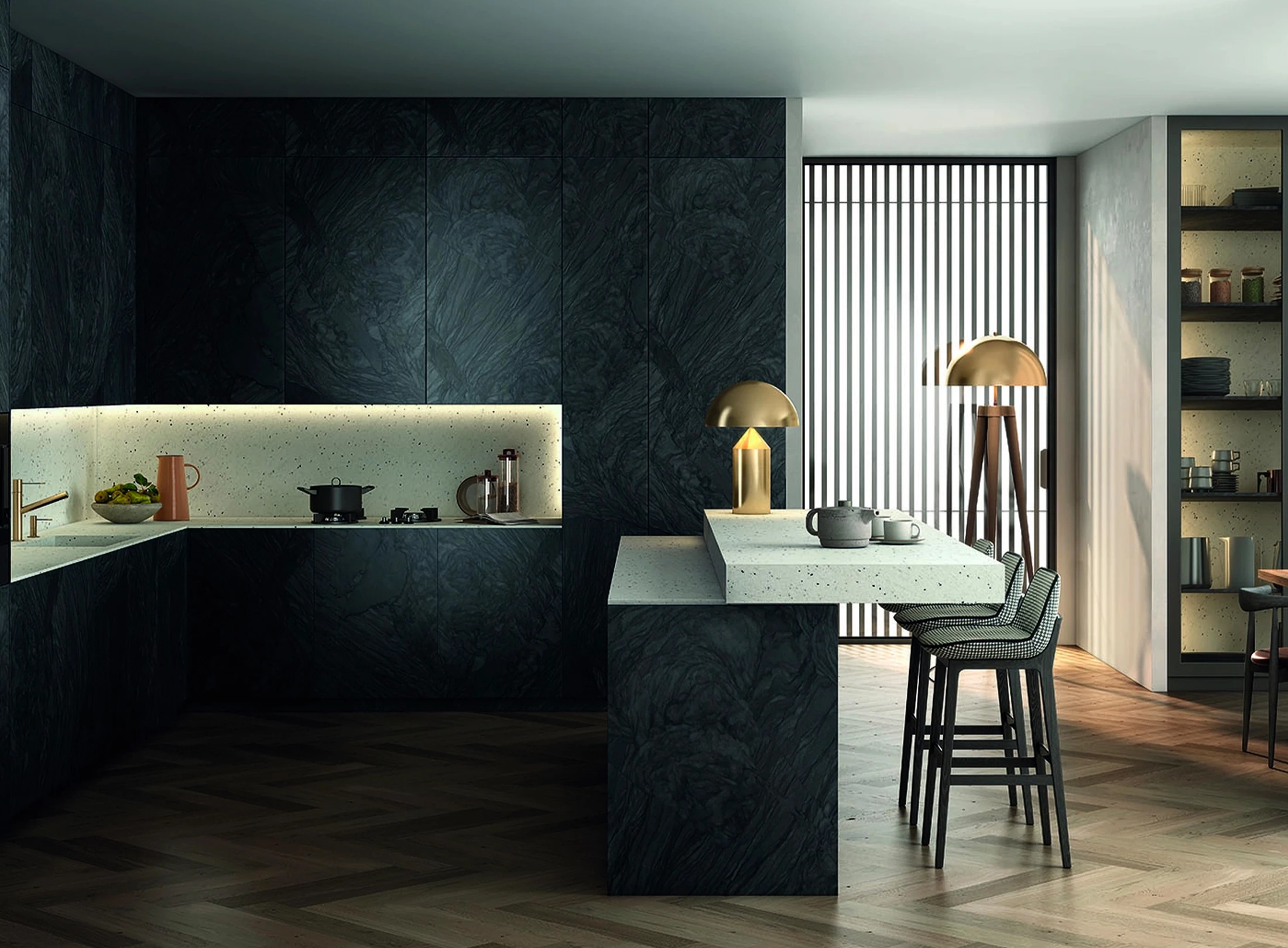 Cuarcita brasileña con fondo blanco que recuerda al color virgen que emana de la fría nieve siberiana. Su diseño se caracteriza por pequeños moteados negros. Autenticidad en estado puro.